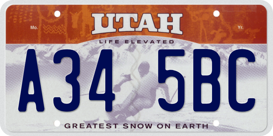 • Life Elevated Skier Plate: Honoring Utah's winter sports legacy, this plate displays a deep blue six-character serial with one letter, three numbers, and two letters. A faded skier image divides the characters. “UTAH” is in white at the top, followed by “LIFE ELEVATED” and “GREATEST SNOW ON EARTH” at the bottom.