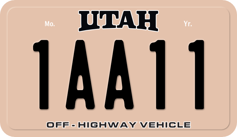 • Off-Highway Vehicle Plate: This plate has a beige background with a five-character black serial. “UTAH” is at the top center, with “OFF-HIGHWAY VEHICLE” printed below in black with a white shadow.
